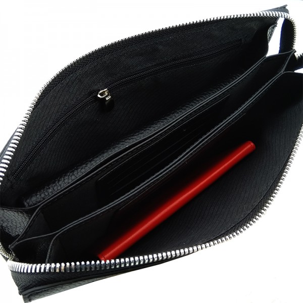 Мужской клатч с тримя объемными отделениями и двумя плоскими, одно из которых закрывается на молнию, ремешок для ношения на руке и прижим для ношения «хватом». Сверху клатч закрывается клапаном с магнитными застежками. На внутренних перегородках нашиты кожаные карманы с прорезями для пластиковых карт. Клатч вместительный, несмотря на относительно небольшие размеры, станет отличным аксессуаром для любого мужчины. |
